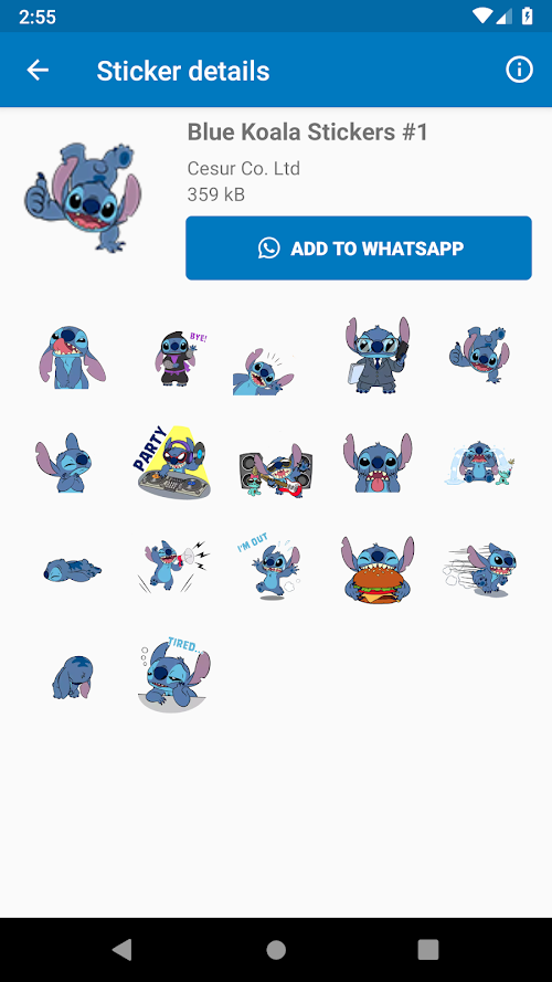 WhatsApp could have done a better job with its sticker feature. And back to this app, I love how it says 2020 because there is another Blue Koala Stitch Stickers For WhatsApp some time ago that’s an older generation. I appreciate the developers for keeping the name straightforward and not confusing at all. This way, people with newer needs or who are looking for something special and more modern, could easily get access to this app. The interface is not the best in this app to be fair because all it has on there is something called a sticker Packs category for you to choose different packs of stickers. I mean, the interface can have a feature with Blue Koala and the wording and selection could be more interesting as well since I’m assuming people who get this app loves animals and cute creatures. It’s just that this app seems too straightforward and a bit dry to use. The app has everything you need because if you think you like one of the Packs of stickers it can take you straight to the adding function of WhatsApp and the demonstrations of each and different single sticker are great and it’s pretty simple to take a look at. All you have to do to get the stickers on WhatsApp is just to download this app which barely takes any space so it’s super friendly to someone who doesn’t have enough storage on their phones. And you open the app and choose the one package you want and add. You will see the set of stickers being added on the WhatsApp messenger.